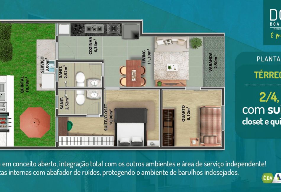 2/4 com suíte, closet e quintal (no térreo) - com área de serviço independente no térreo e conjugada com a cozinha no 1º andar
